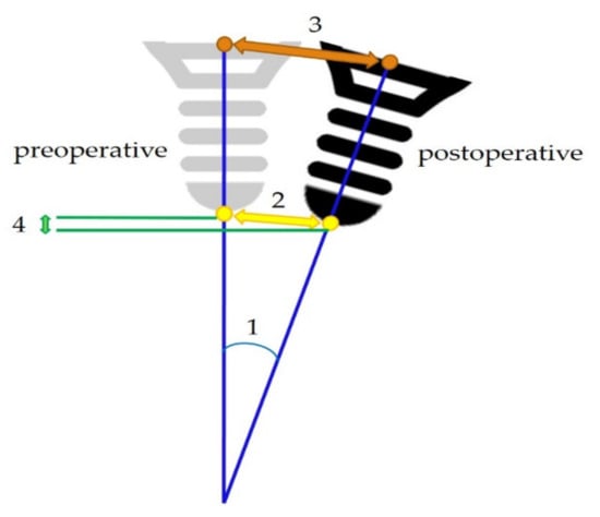 A schema for each deviation measurement from sagittal view: (1) angle deviation; (2) apical lateral deviation; (3) coronal lateral deviation; (4) vertical (depth) deviation.