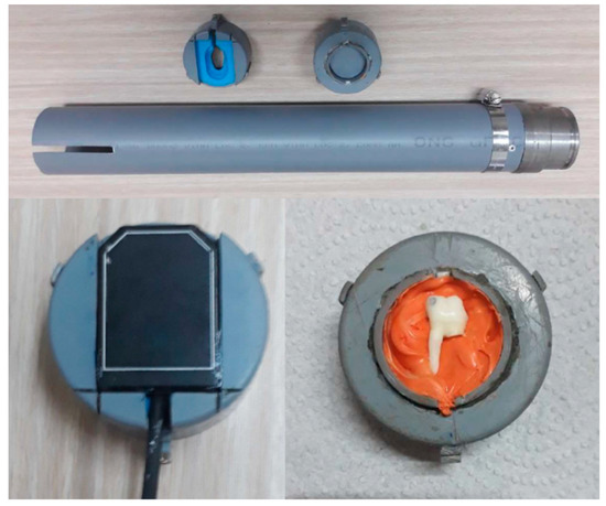 The device for periapical digital radiograph capture. Upper top: parts of the device with long plastic cone at the bottom; lower left: digital sensor in place; lower right: tooth with silicone impression in place.