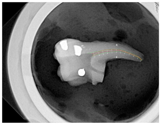 - Freire, L.G.; Gavini, G.; Cunha, R.S.; Santos, M.D. Assessing apical transportation in curved canals: Comparison between cross-sections and micro-computed tomography. Braz. Oral Res. 2012, 26, 222–227. [Google Scholar] [CrossRef] [PubMed] [Green Version]