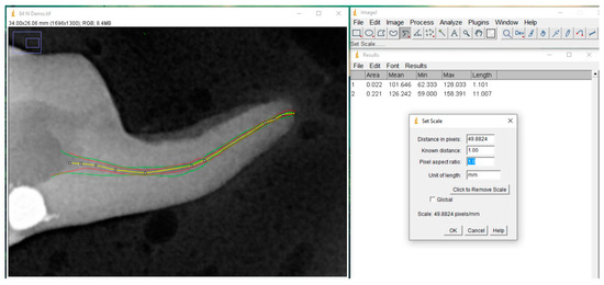 The periapical image was processed using the modified method described by a previous study [2]. The trace of the root canal outline was performed using the Sketch software for mobile phones (SamSung Galaxy Note 10, Samsung, Suwon, Korea). Data were transferred to the computer for further measurements and calculations. The Adobe Photoshop CC 2019 software (Adobe, San Jose, CA, USA) was used for overlapping the before and after instrumentation images, creating the composite image for further analysis (Figure 3). After that, the ImageJ 1.52 (National Institutes of Health, Bethesda, Rockville, MD, USA) was used for tracing and measuring the data on the images acquired from the above step. Measurements were performed on each millimeter from the apex foramen to the level of 7 mm from the apex with an accuracy of 0.001 mm and a magnification of 6 (Figure 4). On the periapical radiograph in the bucco-lingual direction, the difference between the mesial limit of the before instrumentation canal () and the mesial limit of the after instrumentation canal (), and the difference between the distal limit of the before instrumentation canal () and the distal limit of the after instrumentation canal () were measured and calculated. On the periapical radiograph in the mesio-distal direction, the difference between the buccal limit of the before instrumentation canal () and the buccal limit of the after instrumented canal (), and the difference between the lingual limit of the before-instrumentation canal () and the lingual limit of the after instrumentation canal (), were measured and calculated.