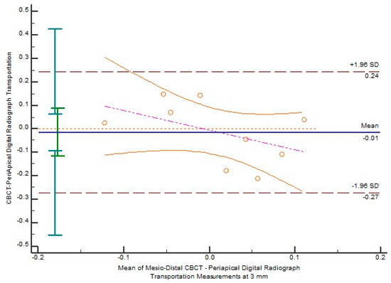 Bland–Altman plot for the agreement between the two methods’ measurements for the transportation in the mesio-distal direction, at a level of 3 mm.
