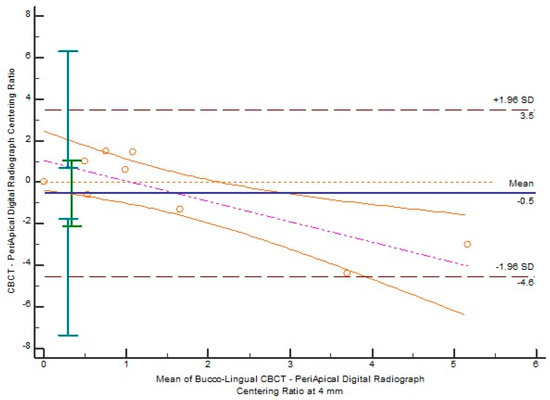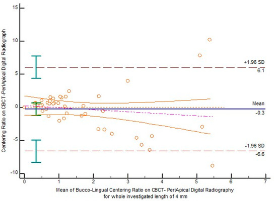 Bland–Altman plot for the agreement between the two methods’ measurements for the centering ratio in the bucco-lingual direction, at a level of 4 mm.