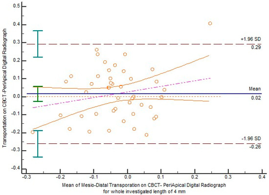 Bland–Altman plot for the agreement between the two methods’ measurements for the transportation in the mesio-distal direction, for the whole investigated length of 4 mm.