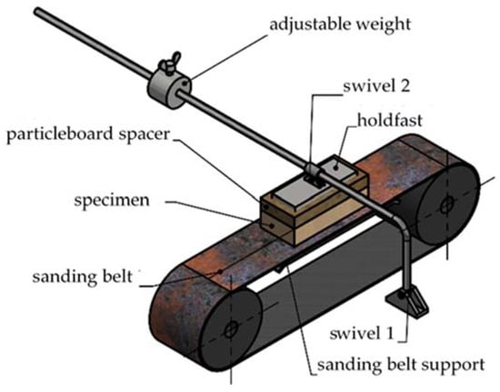 Sanding was performed using a prototype narrow belt sanding machine designed and made in the laboratory of the Department of Furniture Design (Faculty of Wood Technology, Poznań University of Life Sciences PULS). EKA 1000 F (Ekamant, Poland) sanding paper in the form of belts with dimensions 1000 mm × 80 mm was used. The grit of the paper was P120. A sanding belt speed of 14.5 m.s−1 and a sanding pressure of 0.65 N.cm−2 were applied. Dust created during sanding was collected using a multi-purpose vacuum cleaner of the type NT 30/1 Tact (Alfred Kärcher SE & Co. KG, Winnenden, Germany) connected to the working zone. This device ensured a near-total collection efficiency of dust. The principle of test sanding and the scheme of operation of the prototype sanding machine are shown in Figure 1.