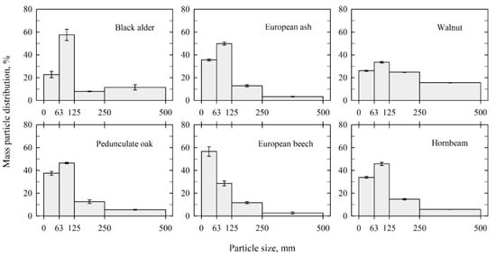 Particle-size distributions of investigated hardwood wood dust by sieving method (n = 3, error bars represent the standard deviation).