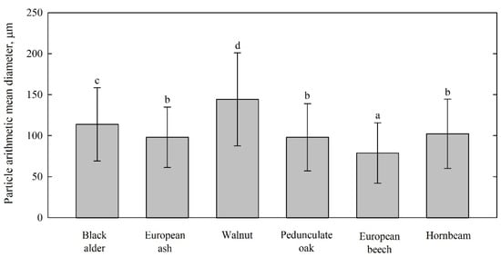 Particle mean diameter of the hardwood species investigated in this work (identical superscripts a, b, c, denote no significant difference for p < 0.05, error bars represent the standard deviation).