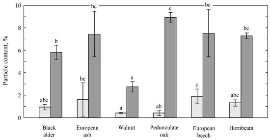 The average mass content of particles smaller than 10 µm in dust from the tested wood species ranged from 2.8% to 8.9% for walnut and oak, respectively. No statistical differences (p = 0.05) of the average content of particles smaller than 10 µm were found in ash, beech, and hornbeam (Figure 4). A similar content of fine dust from the sanding of most hardwood species means that they should be treated with the same considerations to ensure the health and safety of wood industry workers [].