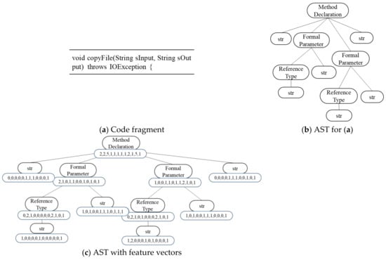 An AST is a tree representation of a code fragment. Since this tree represents the actual structure of a code fragment, studies have used ASTs for code clone detection [16,17,18]. To extract the syntactic representation of a code fragment, code is converted into a set of tokens, and the list of tokens is turned into an AST. Figure 1a is a code fragment of a method signature part. Figure 1b is an AST for the method signature part. Each node of the AST tree structure has a type specifying what it is representing. For example, a type could be a “MethodDeclaration” representing a method definition or a “FormalParameter” representing a parameter for a method declaration. There are two “FormalParameter” subtrees, each with a “ReferenceType” of “str”, that is, String.