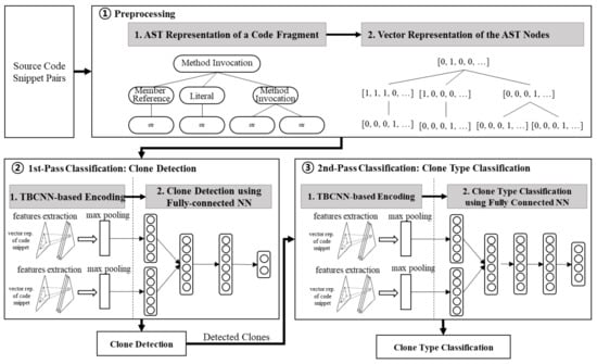 In the remainder of Section 3 we describe the details of the AST embedding process associated with the code preprocessing step, as well as the clone detection and clone type classification steps.