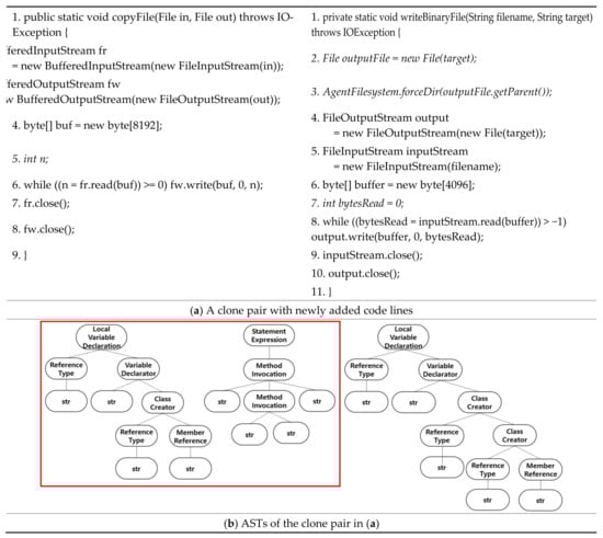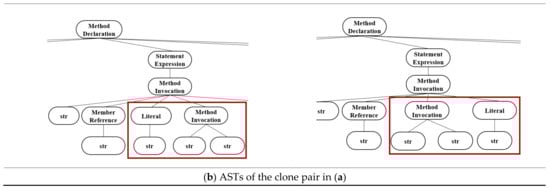 The total number of MT3 clones on BigCloneBench was 20,000, among which 8771 MT3 clones were misclassified (as described in Table 1 and Table 7). Almost 78% of MT3 clones were misclassified as ST3 clones. Examination of a sample code pair (Figure 6a) reveals that the difference between the two code fragments is that lines 2 and 3 of the right-side code are newly added, and line 5 of the left-side code has been changed to line 7 of its right-side code (see lines in italic). The ASTs of this clone pair are identical except for the boxed portion of Figure 6b, a piece of the AST for the right-side code fragment. In most cases where MT3 clones are misclassified as ST3 clones, 70–80% of the AST nodes had identical structures. However, the classification performed using the proposed technique can be regarded as reasonable, recalling that the ST3 clones (similarity of 70–90%) and MT3 clones (similarity of 50–70%) in BigCloneBench are distinguished only by their degree of similarity. Had we not divided T3 clones into ST3 and MT3 categories, our technique would be regarded as performing well on T3 clones.