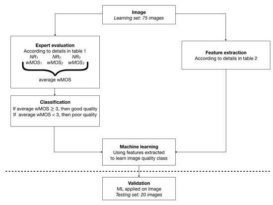 The article is structured as follows. In Section 2 we present the processing pipeline, where we explain how the medical exams were obtained and evaluated by experts, and how we implement the machine learning techniques for image quality assessment of medical images by means of no-reference features. The main results are given in Section 3. We discuss these results and the limitations of our proposal in Section 4. In Section 5 we give some concluding remarks and we outline some future works.