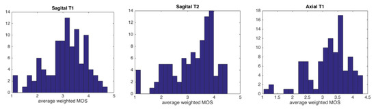 Average weighted Mean Opinion Scores (wMOS) histogram distributions in our three data types, obtained from the experts’ evaluation. From left to right: sagittal -, sagittal - and axial -weighted images.