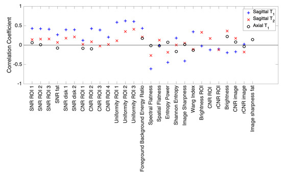 Figure 4 shows correlation coefficients between MOS and each feature used in the objective quality assessment. Most correlation coefficients calculated in the case of Axial images are close to 0, showing that no clear linear relation between MOS and each feature separately exists that could by itself identify “good” or “bad” quality images. A very similar trend is observed in the case of Sagittal images. Considering Sagittal images, a few correlation coefficients rise to a magnitude of 0.6, uniformity measured in the vertebra or spectral flatness, but this correlation is not strong enough to explain the classification obtained by subjective assessment.