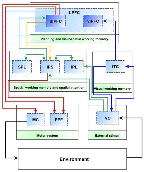 - LPFC module. This module represents the lateral prefrontal cortex (LPFC). Findings in neuroscience indicate that broadly, but strictly within the domain of vision, the entire LPFC is involved in maintenance and manipulation tasks such as attention, working memory, and switching task sets [24]. The LPFC module includes the dlPFC and vlPFC modules. Therefore, this module integrates visual and spatial information coming from the dlPFC and vlPFC modules, respectively, to create visuospatial maps.