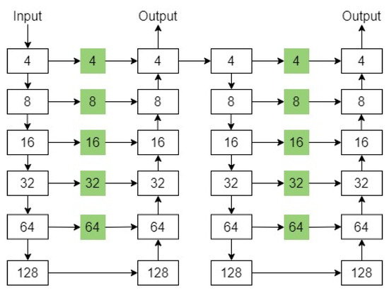 The hourglass network architecture. White squares represent stage nodes and green squares represent sum nodes.