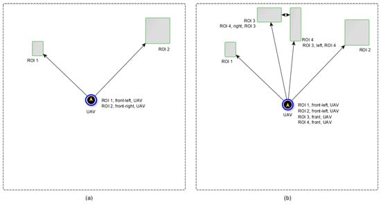 (a) A coordinate map that represents the spatial relationship between the UAV and ROIs identified in the environment. (b) A second coordinate map with additional spatial information between ROIs that are close to each other.