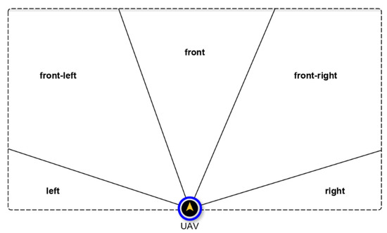 In order to establish the positions of the identified ROIs relative to the UAV, Equations (5) and (6) are defined for segmenting the UAV’s field of view into five regions as shown in Figure 5. These trivial equations allow the UAV to situate ROIs in the environment.