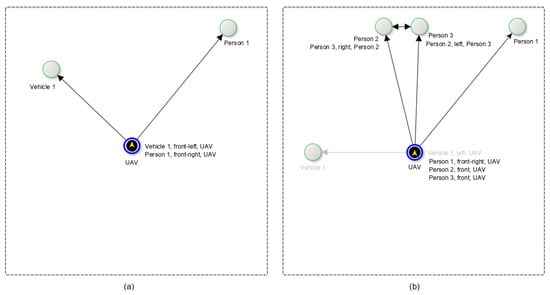 (a) A visuospatial map with information about the identified objects in the environment and their spatial relationship with the UAV. (b) A visuospatial map with additional spatial information about the relation between two close objects. Additionally, a graphical representation is shown of an object (vehicle 1) that is being forgotten.