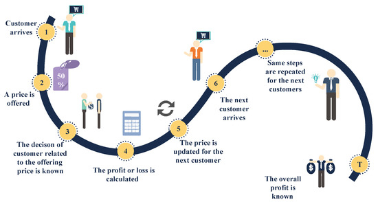The online decision-making framework can be simply explained with a brief example. Imagine a merchant having a small section in a flea market. He owns a few items that need to be sold by the end of the day. Customers approach the rented space one by one asking about the cost of the available commodities. A price is provided by the merchant, and they decide whether to purchase anything or not. The objective here should be to maximize the profit by the end of the day. However, there are some insights about the offered prices to the customers, and they cannot be too high or low.