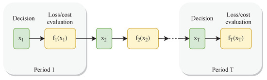 When online optimization is considered, decision-making is conducted in a limited number of consecutive rounds. At each round, the optimization variables are decided without relying on future information. After assigning specific values to the decision variables, the uncertain parameters are realized. Based on the new information (i.e., a loss function), the previous round’s performance can be measured, and the decision for the next round can be updated accordingly.