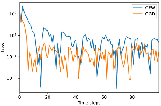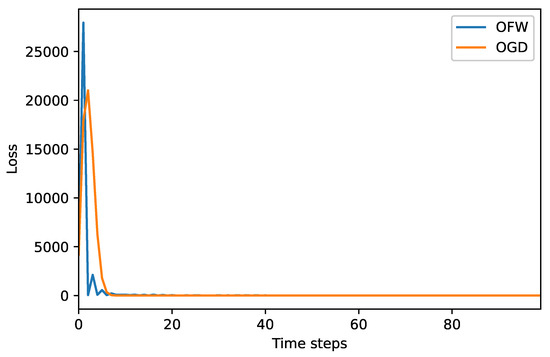 It is important to note that both algorithms were carried out with theoretically recommended step sizes. However, in practice, better performance can be achieved with specially tuned step sizes for both algorithms. For instance, in the case of OFW, it was always observed that if some warm-start modification step was added to the approach, this could quickly decrease the loss and achieve a very small accumulative loss. Similarly, for the OGD case, some time-varying step sizes could result in better performance; however, this depends on the type of problem and the related parameters. To obtain better insights for the step size tuning, sensitivity analysis is a future extension of this work to construct a warm start modification of OFW and a step-size problem-dependent tuning for the OGD algorithm-based approaches.