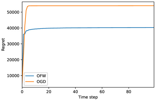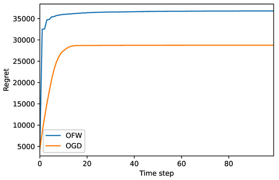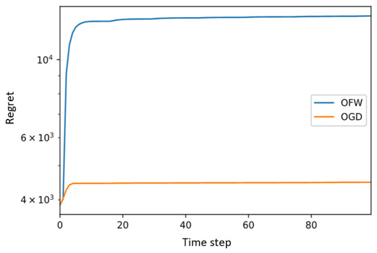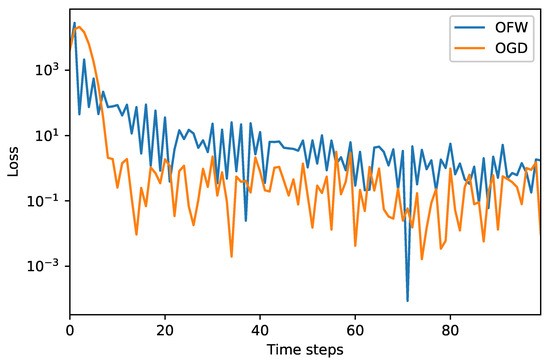 As depicted in these figures, the loss starts to decrease after a few steps of optimization. This decrease is quicker in the OFW case, but both approaches depict a similar behavior where, in some steps, OGD decreases the loss function even further. Next, the regret analysis is conducted in Figure 5. We can see that both algorithms attain a sub-linear regret, which is an important goal when dealing with an online optimization framework, meaning that, when the time increases, the average regret tends to zero or, in other words, online learning is successfully carried out.