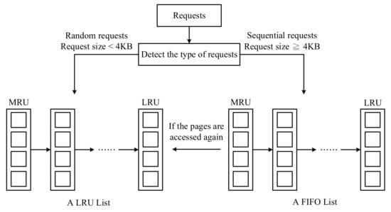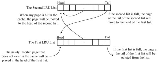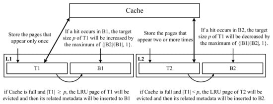 The current mainstream storage architectures [5,6,7] (e.g., SSDs or NVDIMM) usually adopt NAND flash memory as the storage medium. A read/write unit in NAND flash memory [8,9] is a page and cannot be overwritten unless its residing block is erased first. When the number of free pages in NAND flash memory is not enough, the activities of garbage collection will first select a victim block, copy the victim block’s valid pages to other free pages and then erase the victim block to generate a free block. In the process of garbage collection, when a large number of page writes and erase operations are concentrated on a specific block, the block will be quickly worn out to damage the lifetime of NAND flash memory [10,11,12,13]. Therefore, DRAM is usually added to NAND flash memory as cache to store the frequently accessed data, because DRAM has a higher access speed and better reliability than NAND flash memory. So, a cache can speed up the performance of NAND flash memory by reducing the read and write requests. However, the cache capacity is limited. When the cache space is full, how to select the appropriate victims to be replaced has always been an important research topic. In the following, we will introduce some typical cache management methods. Different from the previous cache management methods that mainly consider the temporal/spatial locality, we will modify the ARC method (that will be described later) to both consider the temporal/spatial locality and the request associations between the accessed data to improve the cache hit ratio.