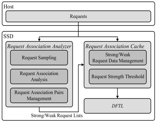 In the paper, we will propose a cache policy based on request association analysis for reliable NAND-based storage systems. The proposed method contains two components: request association analyzer and request association cache, as shown in Figure 5. The request association analyzer is to find out strong and weak requests after performing request association analysis. With the request association analyzer, the request association cache can dynamically separate strong and weak request data and then keep the strong request data in the cache as much as possible to improve the cache hit ratio.
