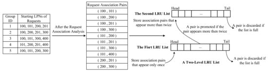 Request association pairs management is to manage association pairs and select the hot association pairs from them. Request association pair management uses a two-level LRU to maintain the association pairs, where the first LRU list stores association pairs that appear once, and the second LRU list stores association pairs that appear more than two times and are considered as the hot association pairs, as shown in Figure 6. As the hot association pairs appear more than two times in the second LRU list, they usually conform to the temporal locality and can be useful in the future.