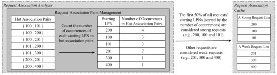 After the hot association pairs are selected, we can extract each request’s starting LPN from the hot association pairs and count the number of occurrences of each starting LPN in all association pairs. For example, Figure 7 shows the number of occurrences of each starting LPN in all association pairs such as (100,101), (100,200), (100,201), (101,200), (101,300), (200,201) and (200,400). Then, we can set a threshold to separate the strong requests according to the number of occurrences of each request’s starting LPN in all association pairs. As shown in Figure 7, assume that the threshold is 50%, the first 50% of all requests’ starting LPNs (sorted by the number of occurrences) are considered as strong requests (e.g., 200, 100 and 101) and are maintained in a strong request list. Other requests are considered as weak requests (e.g., 201, 300 and 400) and are maintained in a weak request list. Later, we will propose how to dynamically adjust the threshold (e.g., 50%) according to the current workload to improve the accuracy and performance in Section 4.3.2.