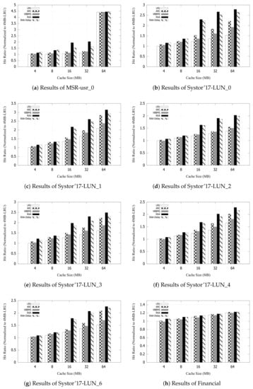 When a cache miss occurs, its performance penalty includes the extra time to access DRAM-based structures. However, DRAM has a higher access speed (e.g., about 20 GB/s) than NAND flash memory because the read and write time of a 16 KB page in NAND flash memory [25,26] are about 80–90 us and 340–900 us. Therefore, the performance penalty of a DRAM cache miss could cost about 100 ns, but a DRAM cache hit can avoid the access time of a 16 KB page in NAND flash memory and save about 80–900 us. Even if the cache hit ratio is only 1%, the time saved can be N * 0.01 * 80 us = N * 800 ns, but the performance penalty of 99% cache misses could be N * 0.99 * 100 ns = N * 99 ns, where N represents the access count to the cache and 80 us represents the read time of a 16 KB page in NAND flash memory. In fact, the actual cache hit ratio of the proposed method under different cache sizes (i.e., 4, 8, 16, 32 and 64 MB) for the eight workload traces is from 2.21% to 73.22%. As a result, the benefit of the cache hits is greater than that of the cache misses. That is why the proposed method and the previous typical methods (such as LRU, ARC, and VBBMS) have to improve the cache hit ratio.