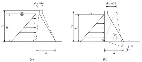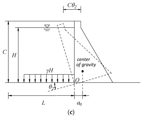 Schematic of the influence of hydraulic load on horizontal dam displacement: (a) horizontal displacement of dam foundation; (b) horizontal displacement caused by rotation of the dam foundation; and (c) horizontal displacement caused by dam rotation and shear horizontal movement. (unit: m).