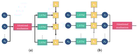 Schematic of the LSTM coupled with the attention mechanism: (a) attention mechanism preceding the LSTM layer and (b) attention mechanism following the LSTM layer.