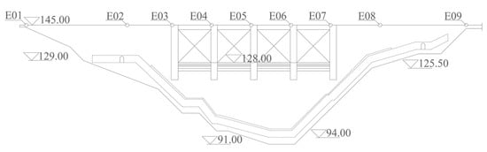 This study uses an integral roller compacted concrete gravity dam located in China as a case to verify the performance of the proposed coupled model. The dam axis is arranged in a broken line, the dam crest elevation is 145 m, the maximum dam height is 63 m, and the dam crest length is 196.62 m. The length of dam sections on the left and right banks are respectively 58.92 and 62.70 m, and there is a longitudinal drainage and grouting gallery in the dam body. The dam began to be closed for water storage in 1993 and passed the completion acceptance in 1995. In order to ensure the safe operation of the project, automatic monitoring equipment is used to continuously monitor the response of the dam structure. Meanwhile, for the realization of the horizontal displacement monitoring, nine measuring points are set on the top of the dam, numbered E01 to E09, as shown in Figure 6. The main distribution of measuring points is one on the left and right sections of the dam, two on the left and right abutments of the dam, five on the overflow section.