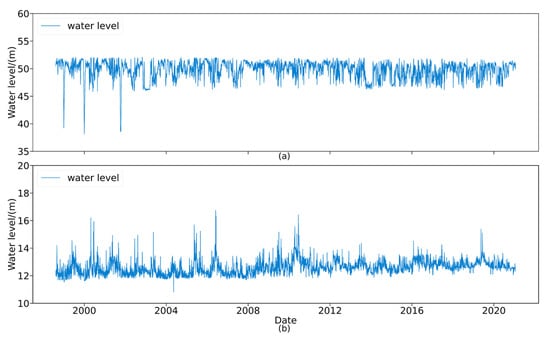 For the problem of dam deformation, it was first necessary to assess whether the influence of downstream water level should be considered. The data of the upstream and downstream water levels are presented in Figure 7. The downstream water level was generally stable compared to the upstream water level and the two water levels were quite different, so the influence of changes in the downstream water level were not included in the dam deformation model.