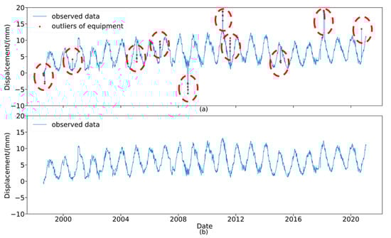 Dam horizontal displacement data collected from automated monitoring equipment: (a) the original data and (b) the data processed through DBSCAN.