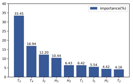 Figure 9 shows the relative importance of the nine input variables as calculated by the RF model using the GS method to optimize parameters. It can be seen that the temperature and water level factors were most relevant to dam deformation, with a relative importance of 60.97% and 21.29%, respectively. While the time component has the lowest bearing on the prediction results. From the perspective of hydraulic structural engineering, these calculated importance values demonstrated that temperature plays a central role in the deformation responses of dam structures, followed by water level, which is in line with the actual situation of the project and is reasonable. Although the time component had little influence on the model, the aging effect of the dam material and its inherent rheological characteristics may need to be analyzed as input variables to improve the nonlinear model.