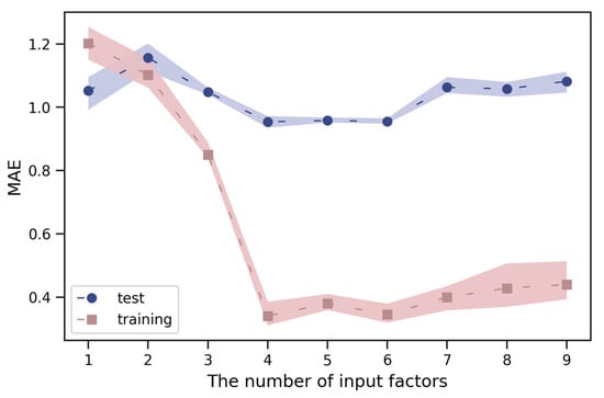 Using the sequential backward selection method, the input variables are sorted from top to bottom according to importance. As can be seen from Figure 9, the order of importance of the input variables was T3, T4, t2, H3, H2, T1, t1, H1, and T2. In this order, the number of input variables fed to the RF model for training and testing is gradually increased. In order to meet the test requirements, 70% of the original data set is used as the training set and the remaining 30% data is used as the test set. Since the input sequence of the data set will also affect the test results, a ten-fold cross-validation is used to ensure the stability and reliability of the test results. The MAE values of the test results are provided in Table 3, and shown in Figure 10 to better visualize the different combinations. There were obvious fluctuations in the MAE values of the test and training sets at the beginning, and has not yet converged. This was because the model weighs the input variables and MAE values, and the effective information provided by the few input variables may not have been enough to represent the original time series. When the process continued and more variables were input, the MAE value significantly declined and the test set and training set began to stabilize. When using four, five, and six input variables, the MAE values of the test sets were basically stable at around 0.95, while those of the training set started to stabilize around 0.35. However, as the input variables continued to increase, the MAE values of the test and training sets increased again, and the increasing trend continued with additional variables. This was because the additional input variables contained redundant data that were not conducive to the prediction results, resulting in new features being captured by the model that contradicted those of the earlier data. Therefore, to ensure that the amount of information contained in the input variables is sufficient, while ensuring that MAE is as small as possible, a sixth plan should be selected to characterize dam deformation.