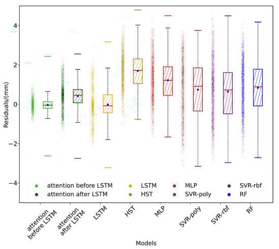 To further compare the stabilities of the prediction results, the prediction residuals of all models were plotted, shown in Figure 11. The plot showed that the residual distribution of the HST model was right-skewed, and the prediction result gradually tended towards the average level of the training model over time. This was because linear fitting is more inclined towards the training data and does not consider non-linear effects of influencing factors, making linear fitting unable to accurately predict displacement caused by extreme weather. Although the distribution of the SVM-poly model was not skewed, its accuracy was not sufficient to meet the needs of dam deformation prediction through the median and quartiles. The SVR-rbf and MLP models showed improved prediction accuracy, but there were still problems with overfitting. The RF model did not exhibit overfitting, due to its own architecture, but it did exhibit generalization errors []. Therefore, the RF model had obvious right skewness, and would eventually tend to predict the average level like the HST model. Due to the introduction of time-dependent storage, the resulting LSTM has greatly improved the prediction accuracy and has a strong ability to represent nonlinear features, but it is still unable to predict peaks, as shown in Figure 12.
