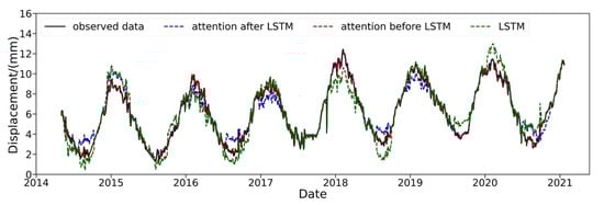 The attention mechanism helps to automatically focus on important factors in the time dimension. This addition significantly improved the ability of the LSTM model to predict the peaks in the observed data. Furthermore, with the attention mechanism, the outliers in the forecasting data were relatively minor and the distribution of the residuals was also relatively concentrated. However, the attention mechanism performance depended on its coupling position, preceding or following the LSTM, and the results showed that when it is coupled before the LSTM layer it had better prediction accuracy. For dam deformation predictions, recent data has a stronger reference value and, as shown in Figure 14, attention disorder occurs when the attention mechanism is coupled after the LSTM layer. This is because after the data is processed by the LSTM layer it will be mapped into a complex high-dimensional tensor which makes it difficult for the attention mechanism to accurately focus on important factors. These observations demonstrated that the attention mechanism should be placed before the LSTM layer to better predict the structural response of dams using complex nonlinear factors and time delay information.