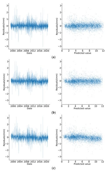 Residuals distribution plot of different models: (a) attention mechanism is coupled before LSTM; (b) attention mechanism is coupled after LSTM; and (c) LSTM.