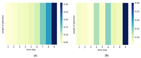 Heat map of attention weight: (a) the attention mechanism is coupled before LSTM and (b) the attention mechanism is coupled after LSTM.