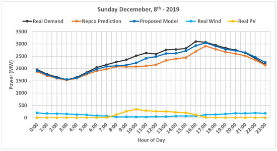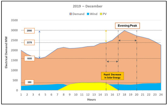 DR had already proven benefits in Jordan. A pilot project was implemented for the principal consumers of NEPCO with smart meters installed, considering incentives, compensations, and non-peak times price penalties. The pilot project resulted in 6 million dollars indirect savings of operating costs and indirectly increased efficiency in the transmission system with reduced bottlenecks and recommended future expansion on commercial and residential consumers, taking into consideration the effect of renewable energy generation [16]. Figure 1 shows the power demand (MW) for a day in December-2019, together with the wind and solar (PV) energy generated through the day.