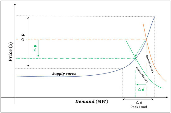 As can be observed in this figure, the evening peak occurs after the rapid decline in renewable energy from 3 to 5 PM, losing almost 380 MW of solar power, while gaining 612 MW in evening load peaking at 6 PM Hence, a deficit of 992 MW needs to be provided by the GO, NEPCO, between 3 and 6 PM, which amounts to 44% of the average load (2256 MW) of that day. It would be highly favorable for the GO to shift and reduce demand from the evening peak to any other time of the day, especially that period with high solar energy. It is notable that, unit commitment planning for optimized power dispatch is based on planning which power plants to operate at what hours. Each power plant has its startup time; combined cycle (CC) power plants need approximately 3 h to operate. Each power plant has different minimum generation limits, depending on whether it operates in a single cycle (SC) or a CC and the number of activated units. Hence, a DR scheme that targets the evening peak in winter can lead to more flexibility in power dispatch operation and shifting from peak power, which forces the GO to operate fast and expensive power plants to ensure reliable operation in peak times. The dual challenge of minimum power and the start-up time of power plants can be solved by using day-ahead unit commitment optimization that relies on day-ahead hourly predictions of the load, power plant availability, energy cost, and available power Egypt’s interconnection. Figure 2 depicts the effects of influencing electrical demand consumption in peak demand periods [17,18]. The price axis represents the cost liability on the GO for meeting specific power demand in the gird, where the cost of producing energy for standard power demand is relatively low, using conventional power generators, but grows extremely high in peak periods. The original demand represented by Demand Curve 1 is influenced by DR at peak time, leading to a decrease in demand (Demand Curve 2) and lower energy prices on the GO.