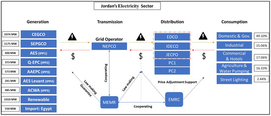 Figure 3 shows the overall architecture of the Jordanian electricity sector, which is mainly composed of three layers: generation, transmission, distribution, and consumers [40]. NEPCO, operated by the government, manages acts as the GO of the power grid under a single buyer model as well as the transmission sector operator. The long-term strategy of the power grid is under the responsibility of the Ministry of Energy and Mineral Resources (MEMR), whereas the Energy and Mineral Regulatory Commission (EMRC) is responsible for establishing regulations and licensing on all levels of the power grid from generation to distribution as well as setting laws and tariffs in the electricity sector [40,41]. Generation is mainly composed of thermal power plants with the respective nominal generating power shown in Figure 3. Generation capacities can be slightly higher or lower depending on hot or cold seasons. Generation can be classified into: Government-owned/partially owned power plants, independent power suppliers (IPPs), and the Egyptian interconnection. The government holds 100% of the shares of the Samra Electricity Power Company (SEPCO), being the largest energy producer, while having only 40% of the shares of the Central Electricity Generation Company (CEGCO), being the second-largest energy producer. Distribution compromising the bulk energy supply is composed of three private distribution companies: Jordan Electric Power Company (JEPCO), Irbid District Electricity Company (IDECO, Jordan north area), and Electricity Distribution Company (EDCO), that are distribute energy to consumers in the central, northern and southern parts of Jordan respectively [40]. Besides, two categories of large energy consumers (principal consumers), PC1 and PC2, are a part of the bulk energy supply. The consumption load types and percentages are calculated according to the 2019 NEPCO report, without taking into account the PC1 and PC2, where domestic and governmental consumers reach up to 49.1% of the main energy consumption, where 6% of it accounts for the governmental buildings and 1.5% for others [8].