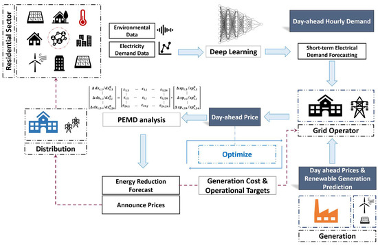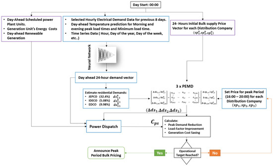 Precise day-ahead information on electrical demand, generation availability, generation costs, and the expected amount of renewable energy generated are highly crucial to implementing the DR system [17]. The GO (NEPCO) aims to reduce the cost of energy production, especially at peak periods, to reduce the expensive energy purchased from IPP3 and IPP4, while increasing the demand in off-peak periods to maximize its net profit. The DR system can influence consumer behavior from peak to off-peak and allow the grid higher flexibility acting as a safety margin in cases of high expected demand. NEPCO’s main responsibility is to implement a precise day-ahead hourly demand prediction to estimate the demand every hour for the next day. Since the GO, as per grid regulations, provides the fuel for the power plants, the day-ahead cost of energy purchase is correlated to fuel prices known by the GO; therefore, the generation costs are given. Furthermore, the GO utilizes the PEMD to predict the effects of different prices on the residential consumers and decide the best price to achieve the required goals relating to peak demand reduction and off-peak filling by increasing the prices at peak loads and reducing them at off-peak periods. It is noted that the prices are announced to the distribution companies at the start of each day, where they announce them to their consumers through specially designed schemes.