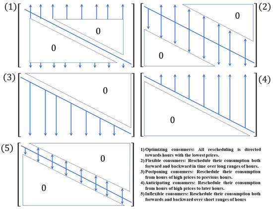 The categories of behaviors for day-ahead demand response are (1), (2), and (5), where the last two are the most probable, as it is unlikely that consumers are extremely optimized to fully reschedule their demand to hours of least price. The difference between flexible and inflexible consumers is the time horizon to where demand at a certain hour is rescheduled to other hours of the day, depicted by the arrow lengths in Figure 6. The selection of this horizon is based on a detailed analysis of the types of loads that exist, where water heating, for example, can be shifted to a larger time horizon prior to periods of high demand than other appliances such as lighting [47].