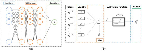 Neurons are the building blocks of a neural network, as shown in Figure 7b [50], where the output for the th neuron in hidden layer with an activation is depicted as follows: