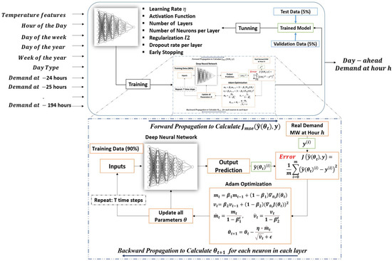 Finally, Figure 8 depicts the training and tunning process for the proposed deep neural network model used in this study to predict the day-ahead 24-h demands. The model predicts the day-ahead demand at a specific hour starting from the end of the previous day; the model is run 24 times to predict the next day’s hourly demand hour by hour. The selection and detailed analysis of the input features is discussed in detail in the following section. The four-year hourly demand dataset was split into 90% training data to train the model, 5% validation data to tune the hyperparameters and select the best architecture, and 5% testing data coupled with the last month of 2019 used as a final test of the model’s generalization performance. Achieving high prediction accuracy is essential for the DR model and is achieved through careful feature selection coupled with selecting an optimal neural network architecture. In addition, since deep neural networks are prone to overfitting, both regularization [59] and the dropout [60] techniques were applied coupled with early stopping to increase the generalization performance of the model [61]. The final model performance is compared across all the data splits mentioned using the mean absolute percentage error (MAPE), and the root mean square error (RMSE) [62].