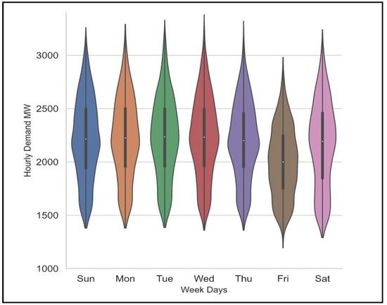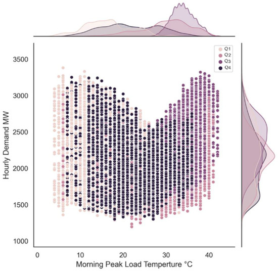 The electrical demand is a highly complex time series that is a function of human daily and seasonal behaviors and weather conditions, making it heterogeneous and uncertain. In Figure 10 the weekly variation of the electrical demand is represented by the probability density distribution for different days of the week. An apparent increase in peak demand occurs from Saturday through Wednesday, then declining towards Friday, where Friday and Saturday represent the weekend holidays. As previously shown in Figure 1 the daily demand is also affected by the hour of the day, where the peak demand occurred for that specific day at 6 PM, while the lowest occurred at 4 AM. Hence, time-series features such as an hour of the day, day of the week, as well day of the year carry essential information for the STLF [63]. In Figure 11, and for each quarter of the year (Q1–Q4), where Q1 represents the first three months starting from January, the variation of hourly demand with the change of temperature is shown. Electrical demand peaks at winter (end of Q4–Q1) and summer (end of Q2–Q3) temperatures, as consumers are more likely to use space heating and cooling. On days characterized with thermal comfort between 20 and 30 °C, the average demand is lower. The curves on top and to the right of the figure show the probability density distribution for demand and temperatures per quarter, where it can be observed that the third quarter depicting two thirds of the summer season, had the highest demands on average.
